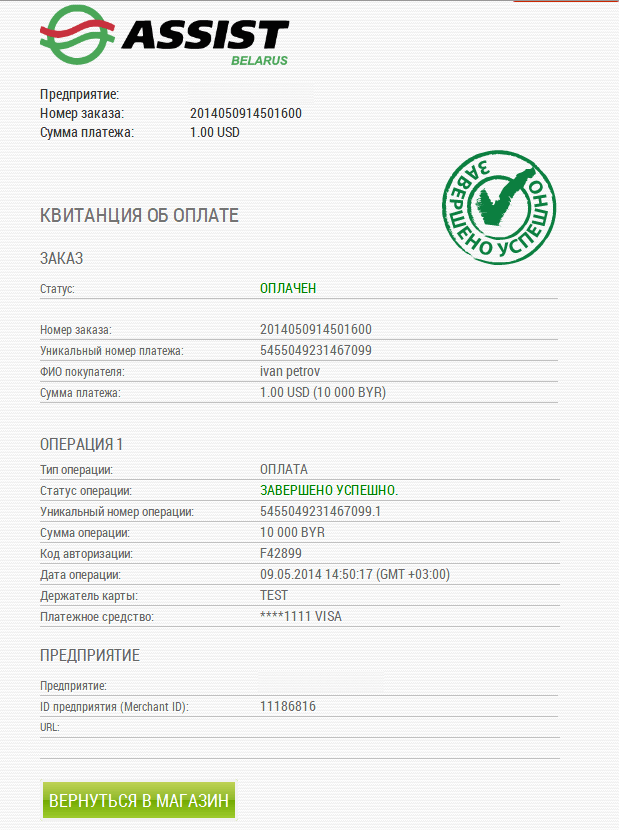 4. Об успешном завершении платежа вы будете проинформированы сообщением следующего вида: